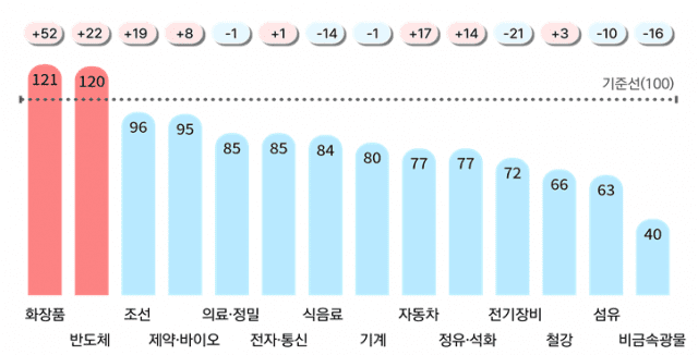 업종별로는 14개 조사대상 가운데 반도체와 화장품 2개 업종만 기준치(100)를 상회했다. 반도체는 AI 확산과 데이터센터 투자 확대에 따른 HBM 수요 증가, 범용 메모리 공급 부족에 따른 가격 상승이 겹치며 전 분기 대비 22p 오른 120을 기록했다. 화장품은 북미·일본·중국 등에서 K-뷰티 위상 강화로 수출 호조가 이어지며 가장 큰 폭(+52p) 상승했다.