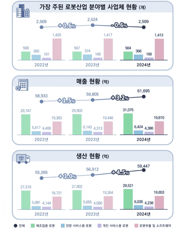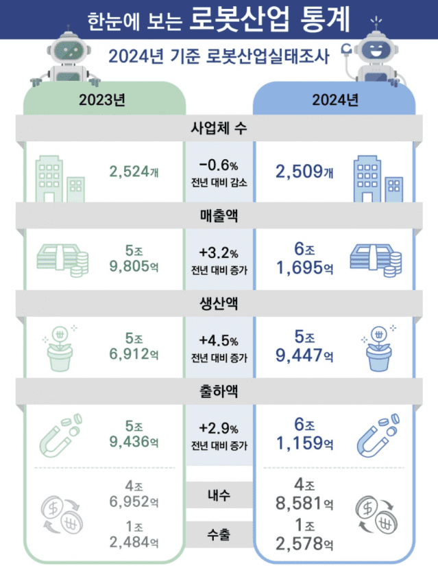 국내 로봇산업 매출 규모가 작년 기준 6조원을 돌파했다. 사업체 수는 소폭 줄었지만 매출과 생산, 인력은 모두 증가하며 완만한 성장세를 이어갔다. 특히 로봇부품과 소프트웨어 수입액이 눈에 띄게 늘었다.