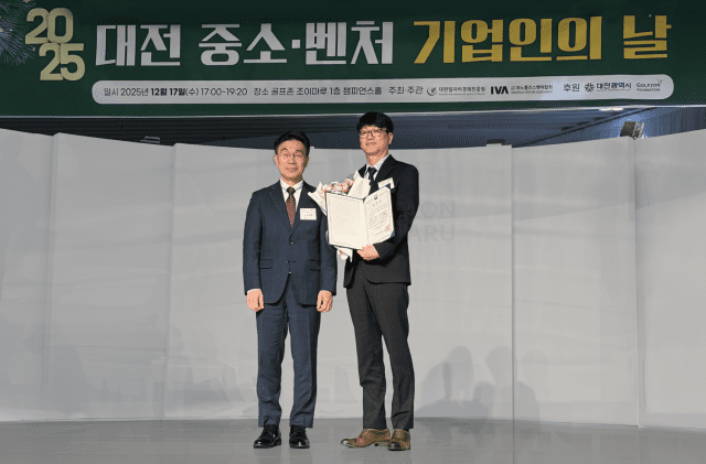 이번 표창은 대전시와 대전·세종지방중소벤처기업청, 이노폴리스벤처협회가 공동 주최한 '2025 대전 중소·벤처기업인의 날' 행사에서 수여됐다. 벤처기업육성에 관한 특별법에 따라 벤처기업으로 확인받은 기업인 가운데 기술·경영 혁신 역량과 대외 경쟁력, 기업 윤리 및 사회공헌도 등을 종합적으로 평가해 선정된다.