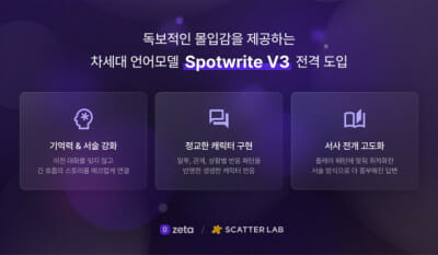 스캐터랩은 이번 업그레이드에서 기존 언어모델을 고도화한 '스팟라이트 V3'를 적용해 기억력과 AI 캐릭터 답변의 서술 품질을 끌어올렸다. 특히 긴 호흡의 스토리도 이전 대화와 맥락을 자연스럽게 반영하는 장기 문맥 이해 능력이 개선됐다. 또 제타 플레이 환경에 맞춰 설계한 자체 데이터셋을 기반으로 파인튜닝과 강화학습을 진행했다.