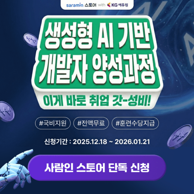 모집 기간은 내년 1월 21일까지로, 사람인스토어에서 수강 신청 후 KG아이티뱅크의 개별 상담과 국민내일배움카드 발급 과정을 거치면 된다. 특히 사람인스토어에 등록된 전용 링크를 통해 신청한 훈련생에게는 과정 수료 후 이력서에 ‘부트캠프 인증뱃지’가 부여되는 혜택이 제공된다. 해당 인증뱃지는 교육 이수 사실을 시각적으로 증명해 채용 과정에서 직무 역량을 보다 효과적으로 어필할 수 있도록 돕는다.