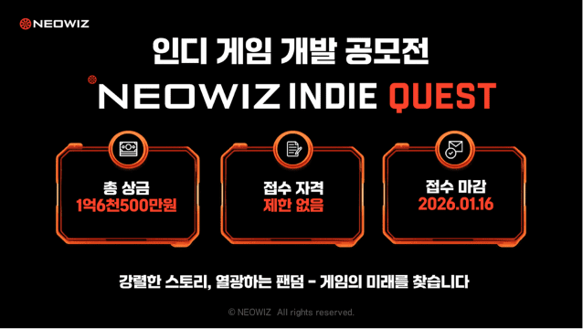 ‘네오위즈 인디 퀘스트’는 글로벌 인디 게임 개발을 장려하고, 창작자에게 실질적인 개발 환경을 지원하기 위해 마련된 공모전이다. 창의적인 세계관, 스토리, 캐릭터가 연결된 게임 내러티브의 가치를 조명하고, 최종 선발된 총 10개 팀에게는 총 1억6천500만원의 상금과 함께 게임 홍보, 멘토링 등 네오위즈의 전략 컨설팅 기회가 주어진다.