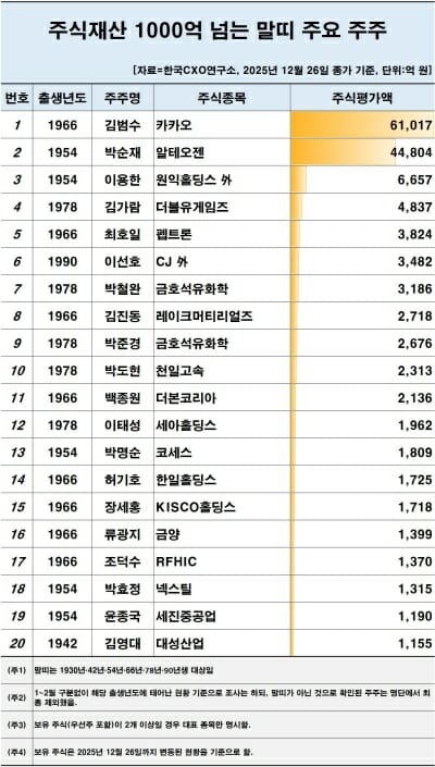 조사 대상 중 주식 재산이 1조원이 넘는 주주는 김범수 카카오 창업자(6조 1천 17억원)와 박순재 알테오젠 회장(4조 4천804억원) 2명이다. 김범수 창업자는 1966년생, 박순재 회장은 1954년생 말띠에 해당한다.