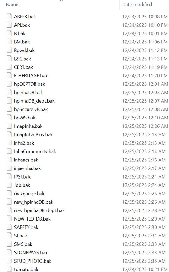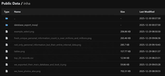 이어 건라는 랜섬웨어 공격 성공을 증명하기 위해 20개의 샘플 데이터를 공개했다. 해당 데이터에는 학생들의 이름, 학점, 이메일 등 개인정보 리스트를 업로드했다. 또 인하대의 백업 파일로 보이는 항목도 탈취한 흔적이 확인됐다.