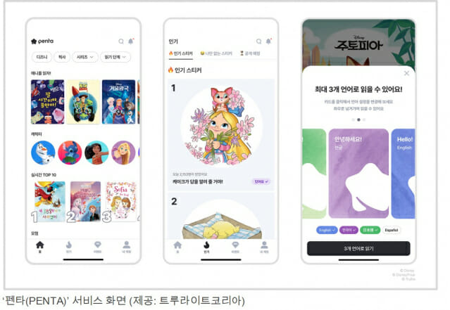 31일 디지털 콘텐츠 기업 트루라이트코리아(대표 한정윤)는 전세계 그림책을 세로 스크롤 방식으로 제공하는 다국어 플랫폼 ‘펜타(PENTA)’를 31일 아태지역과 남미에서 공식 출시했다고 밝혔다. 월트디즈니 컴퍼니(이하 디즈니)와의 협업을 통해 제작한 디즈니·픽사 스토리를 담은 그림책을 처음으로 선보였다.