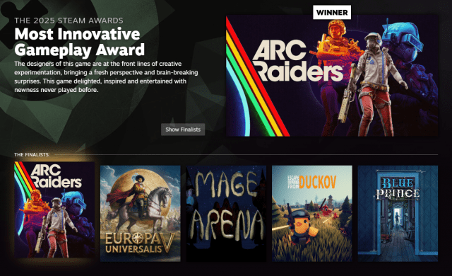 벨브는 4일 플랫폼 이용자 투표로 진행된 '2025 스팀 어워드' 부문별 수상작을 공식 발표했다. 넥슨 자회사 엠바크스튜디오가 개발한 익스트랙션 슈터 아크레이더스는 이번 시상식에서 '가장 혁신적인 게임플레이' 부문 수상 영예를 안았다.
