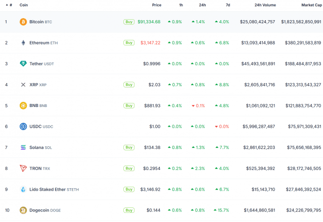 상승 그룹에서는 비트코인과 이더리움을 중심으로 주요 자산 전반이 동반 상승했다. 비트코인은 주간 기준 4% 상승하며 9만1천334.68달러에 거래됐다. 이더리움은 같은 기간 6.8% 상승해 3천147.22달러를 기록했고, 이더리움 기반 스테이킹 자산도 주간 기준 6.7% 상승하며 현물과 유사한 흐름을 보였다.