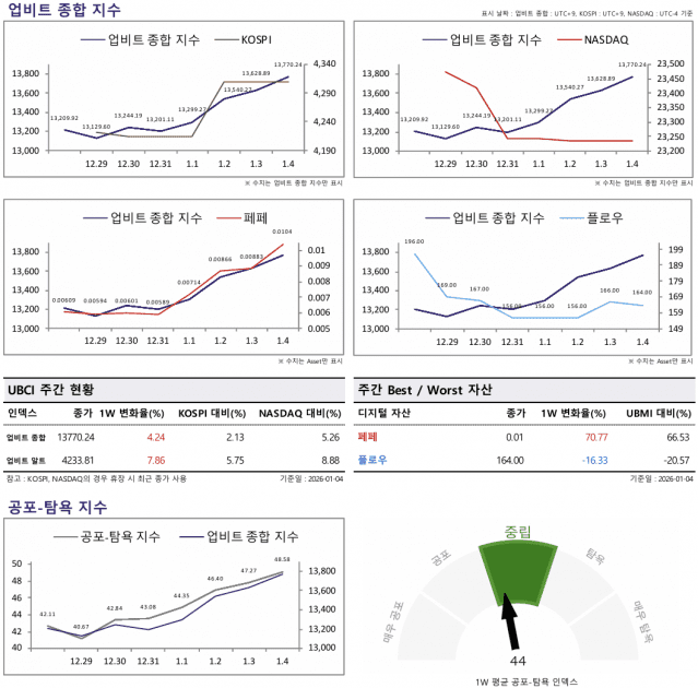 지난 12월 29일부터 1월 4일까지 한 주 동안 업비트 종합지수는 전주 대비 4.24% 상승했고, 업비트 알트코인 지수는 7.86% 오르며 종합지수 대비 높은 상승률을 기록했다.