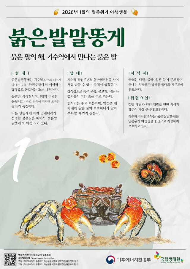 기후에너지환경부는 2026년 병오년 붉은 말의 해를 맞아 1월 ‘이달의 멸종위기 야생생물’로 멸종위기 야생생물 Ⅱ급인 ‘붉은발말똥게’를 선정했다고 5일 밝혔다.