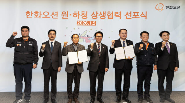 한화오션은 5일 서울 중구 서울사무소에서 ‘원·하청 상생협력 선포식’을 열고 경영성과를 차별 없이 공유해 보상 격차를 줄이는 한편, 무재해 사업장 구축과 근로조건 개선에 공동으로 나서기로 했다고 밝혔다.