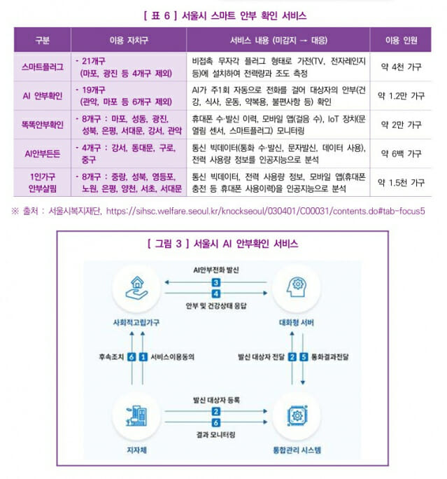 이에 서울, 광주 등 전국 다수 지방자치단체가 SKT, KT 등 민간 통신사의 AI 기술을 활용해 독거노인 등 1인 취약가구를 대상으로 AI 안부확인 서비스를 도입했다. 서울시는 AI가 주 1회 자동으로 전화를 걸어 건강, 식사, 운동, 약 복용, 불편사항 등을 확인하는 'AI 안부확인 서비스'를 19개 자치구에서 약 1만 2천 가구에 제공한다. 또한 휴대전화 통신 이력, IoT 디바이스, 모바일 앱 걸음수를 종합 모니터링하는 '똑똑안부서비스', 통신 빅데이터와 전력사용량을 AI로 분석하는 'AI안부든든서비스' 등 다양한 스마트 안부 확인 서비스를 운영 중이다.