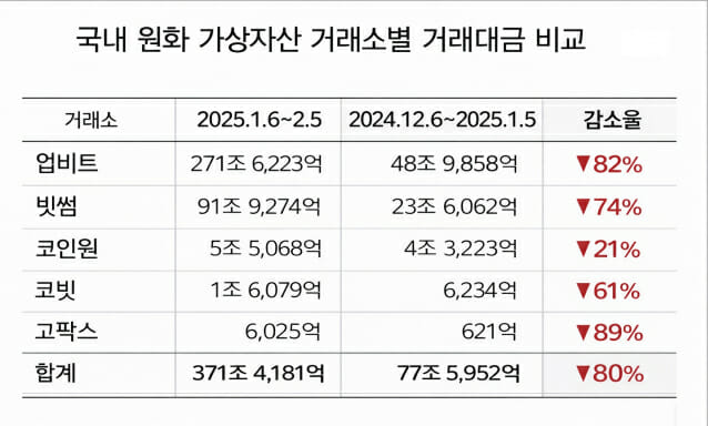 5일 가상자산 분석 플랫폼 코인게코에 따르면, 최근 한 달(2025년 12월 6일~2026년 1월 5일) 동안 국내 원화 가상자산 거래소 5곳 총 거래대금은 약 77조5952억원으로 집계됐다. 이는 전년도 비슷한 시기(2025년 1월 6일~2월 5일) 거래대금(371조4181억원)과 비교해 약 80% 감소한 수준이다.