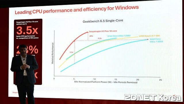 케다르 콘답 본부장은 "스냅드래곤 X2 플러스는 인텔 코어 울트라 200V(루나레이크), AMD 라이젠 AI 300 등 x86 기반 경쟁사 프로세서 대비 더 적은 전력으로 높은 성능을 내도록 설계됐다"고 강조했다.