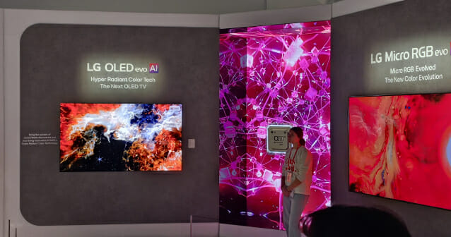 LG전자는 이번 전시장에 AI로 성능을 강화한 프리미엄 TV 라인업을 전면에 내세웠다. 9mm대의 매우 얇은 두께로 구현된 차세대 월페이퍼 TV 'LG 올레드 에보 W6', 회사의 첫 마이크로 RGB TV인 '마이크로 RGB 에보' 등이 대표적인 제품이다.