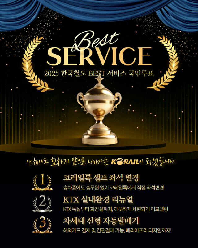 한국철도공사(코레일)는 2025년 최고의 철도서비스로 ‘코레일톡 셀프 좌석변경 서비스’가 선정됐다고 밝혔다.