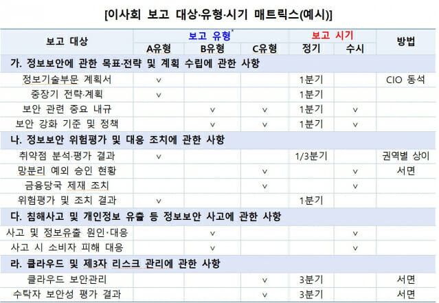 '금융보안 관련 이사회 보고사항 안내서'는 금융회사가 이사회 보고 의무를 원활히 이행할 수 있게 ▲보고 대상 ▲보고 체계 ▲보고 절차 등을 구체적으로 안내하는 한편 보고 대상별로 참고할 수 있는 보고서 샘플을 함께 제공, 실무 활용도를 높였다.