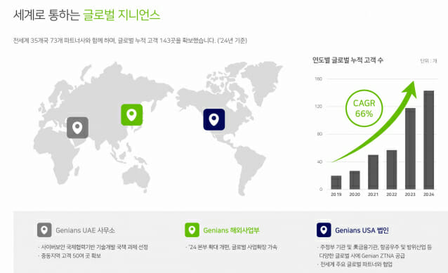 글로벌 시장에서도 성과가 이어지고 있다. 2025년 말 기준 지니언스는 국내외 180여 곳의 고객사를 확보하고 있으며, 글로벌 ZTNA 및 EDR 고객도 확보를 위해 지속적으로 노력 중이다."