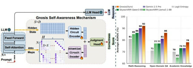 AI가 스스로 "이 답변은 틀릴 것 같아요"라고 판단할 수 있을까? 캐나다 앨버타대학교 연구팀이 AI가 외부 도움 없이 자신의 오류를 예측하는 기술을 개발했다. '노시스(Gnosis)'라는 이름의 이 기술은 매우 적은 용량으로도 훨씬 큰 검증 시스템보다 뛰어난 성능을 보여준다. 연구팀은 이를 AI의 '자기 인식 능력'이라고 부른다.