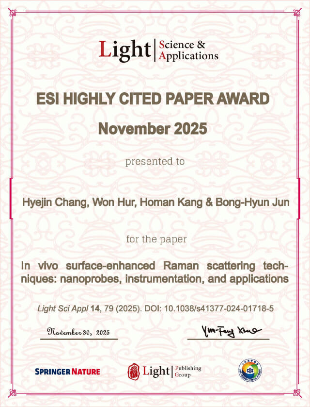 수상 논문은 ‘In vivo surface-enhanced Raman scattering techniques: nanoprobes, instrumentation, and applications’라는 주제로 ‘Light: Science & applications(JCR 2024 기준 IF=23.4, 광학(Optics) 분야 상위 3% 이내)’에 출판한 논문으로, 생체 내 표면증강 라만산란(SERS) 기술을 중심으로 나노프로브 설계, 광학 계측 시스템, 진단·치료 응용까지 전반을 체계적으로 정리해 높은 학술적 완성도를 인정받았다.