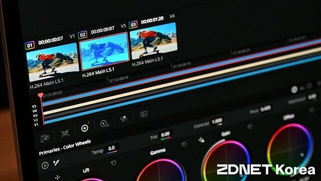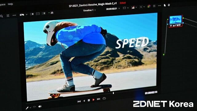 시연장에서는 동영상 편집 프로그램인 다빈치 리졸브를 이용했다. 스케이트보드를 타고 달리는 선수의 영상에서 주황색 상의 일부분만 선택해 파란색으로 바꿨다.