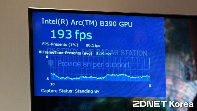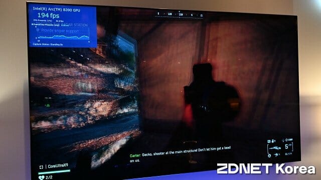 인텔은 시연장에서 '배틀필드6' 게임을 구동해 아크 B390 GPU의 성능을 시연했다. 1920×1080 해상도에서 XeSS 3와 AI 프레임 생성 기능이 활성화된 상태에서 초당 190-200 프레임을 넘나드는 성능을 보여줬다.