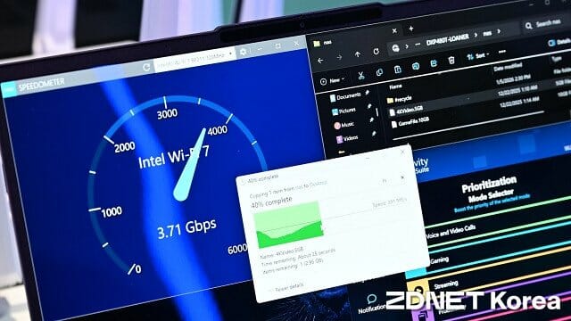 시연장에서는 와이파이7을 지원하는 고성능 유무선공유기인 에이수스 ROG 랩처 GT-BE19000AI에 연결된 PC로 용량 5GB 동영상을 복사했다. 측정된 순간 전송 속도는 3.71Gbps(391MB/s)이며 약 13초만에 파일 복사가 끝났다.