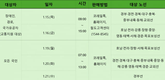 19일부터 21일까지 사흘간 오전 7시부터 오후 1시까지는 경로·장애인·국가유공자(교통지원 대상)를 포함한 모든 국민을 대상으로 예매가 진행된다.