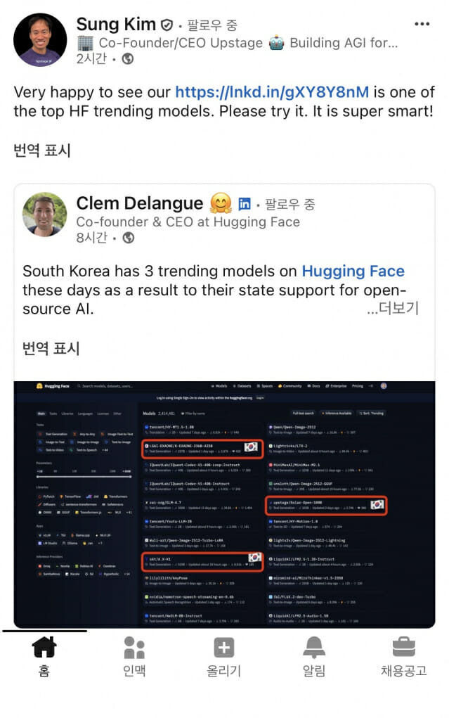 김성훈 업스테이지 대표는 "우리 모델이 허깅페이스에서 상위 트렌딩 모델 중 하나로 선정돼 매우 기쁘다"고 링크드인에서 밝혔다.