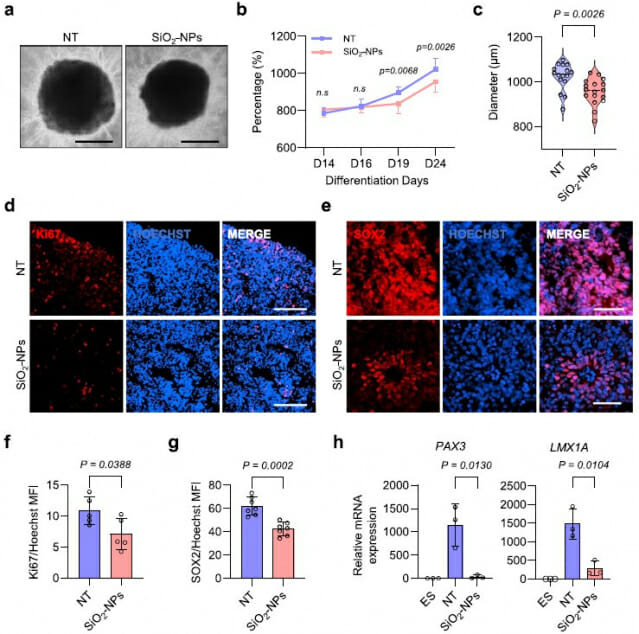 연구팀은 이를 위해 인간 다능성 줄기세포(hPSC)로부터 도파민 신경계가 형성되는 중뇌 오가노이드를 제작하고, 신경발달 초기 단계에서 실리카(SiO₂) 나노입자 노출에 따른 변화를 분석했다.