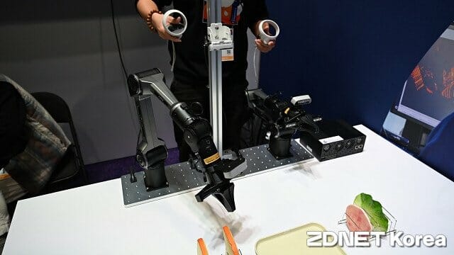 전시장에는 드래곤윙 IQ10으로 구동되는 샌드위치 조립 로봇이 배치됐다. 파이제로 기반 VLA(영상-언어-동작) 모델을 300여 개 데이터셋으로 학습한 다음 식빵과 햄, 양상추 모형을 양쪽에서 하나씩 집어와 마치 사람처럼 샌드위치를 만든다.