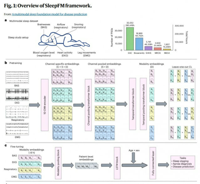 SleepFM은 병원에서 하는 '수면다원검사'라는 정밀 검사 데이터를 활용한다. 수면다원검사는 잠자는 동안 머리에 센서를 붙여 뇌파를 측정하고, 가슴에 전극을 붙여 심장박동을 기록하며, 코와 입 주변에 센서를 달아 호흡 패턴을 관찰하는 검사다. 근육 움직임도 함께 측정한다.