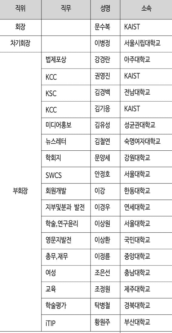 부회장 17명은 ▲법제포상 강경란 교수(아주대) ▲KCC 행사 권영진 교수(KAIST), 김기웅 교수(KAIST) ▲KSC 행사 김경백 교수(전남대) ▲미디어홍보 김유성 교수(성대) ▲뉴스레터 김철연 교수(숙대) ▲학회지 문양세 교수(강원대) ▲SWCS 행사 안정호 교수(서울대) ▲회원개발 이강 교수(한동대) ▲지부 및 분과 발전 이상환 교수(국민대) ▲학술&연구윤리 이상원 교수(서울대) ▲영문지발전 이상환 교수(국민대) ▲총무&재무 이정륜 교수(중앙대) ▲여성 조은선 교수(충남대) ▲교육 조정원 교수(제주대) ▲학술평가 탁병철 교수(경북대) ▲iTIP 행사 황원주 교수(부산대) 등이다.