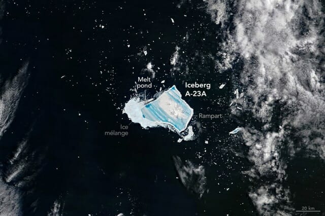 우주에 있는 우주비행사와 미국 항공우주국(NASA)의 지구관측 위성 테라(Terra)는 남극 인근을 표류 중인 A-23A 빙산이 달라진 모습을 포착했다.