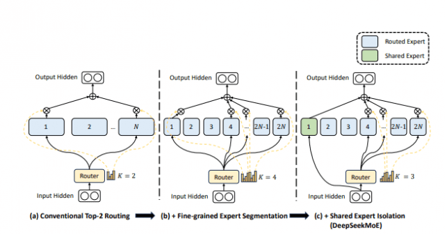 딥시크는 기존 MoE 보다 전문가 모델을 더 세분화하고 어떤 질문이든 공통적으로 필요한 지식을 다루는 일부 모델은 항상 대기시키는 방식을 더해 딥시크MoE라는 독자적인 변형 아키텍처로 발전시켰다.