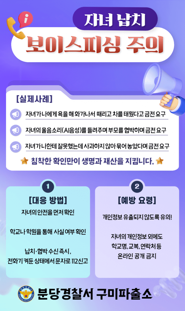 실제로 분당 경찰서는 지난달 자녀를 노린 보이스피싱 사건이 많이 발생하고 있다며 사례와 함께 대응 방법과 예방 요령 등을 공유했다.