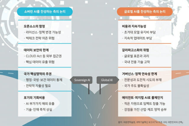 보고서는 소버린 AI 논쟁을 ‘국산 대 글로벌’의 단순 대립으로 접근해서는 안 된다고 강조한다. 소버린 AI가 무엇을 얻고 무엇을 포기하는지, 비용·리스크·효과를 냉정하게 비교해야 한다는 취지다.
