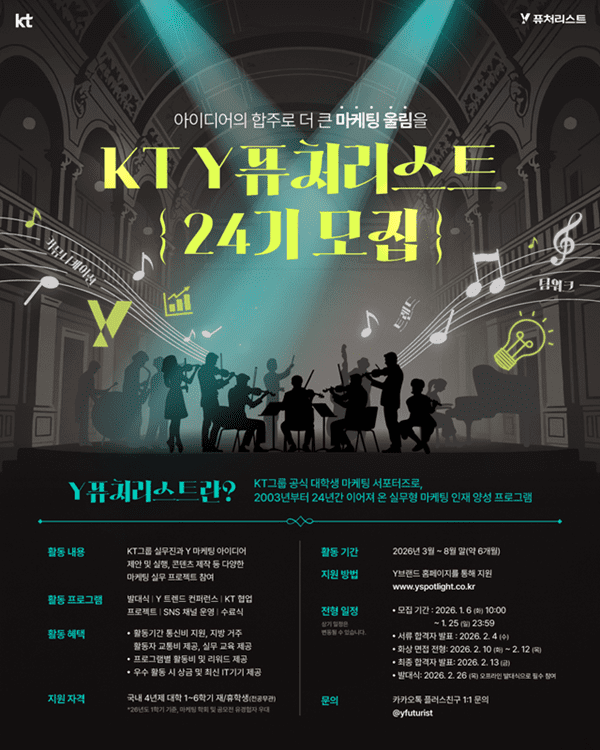 KT는 내년에 활약할 대학생 마케팅 서포터즈 ‘Y퓨처리스트’를 오는 25일까지 모집한다고 14일 밝혔다.