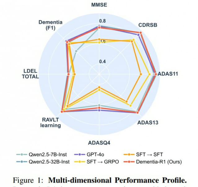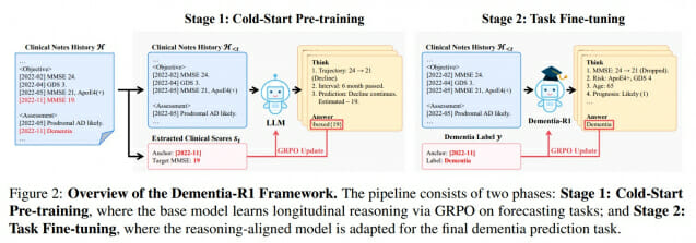 2단계에서는 학습된 모델을 치매 여부를 판단하는 최종 진단에 적용한다. 이때는 맞음/틀림이라는 단순한 신호만 주어지지만, 1단계에서 이미 시간에 따른 증상 변화를 읽는 법을 배웠기 때문에 안정적으로 학습된다. 연구팀은 GRPO라는 효율적인 학습 알고리즘을 사용했다.