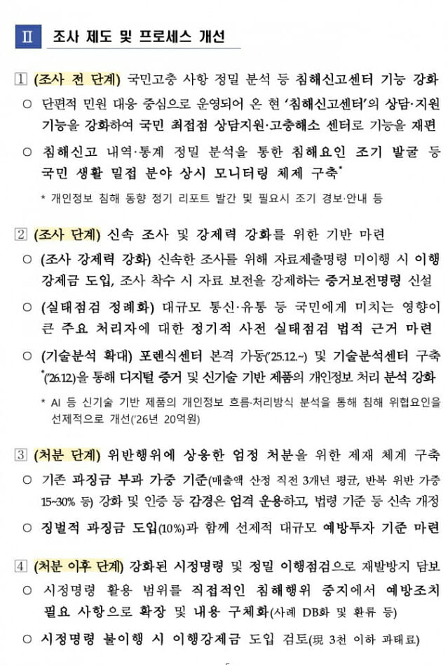 국민 최접점에서 상담 지원 및 고충해소 역할을 하는 '개인정보 침해신고센터' 기능을 강화해 권리구제 방안 안내를 강화하고, 개인정보 침해 요인을 조기에 포착하는 상시 모니터링 체계를 구축한다. 또 자료제출 미이행 시 이행강제금 도입, 자료 보전을 강제하는 증거보전명령 신설, 정기적 사전 실태점검을 위한 법적 근거 마련 등을 통해 조사 강제력을 강화하고, 신속한 조사가 가능하도록 개선한다.