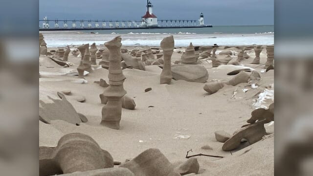 미국 시카고 겨울의 낮은 기온과 강풍은 겨울철 보기 드문 장관을 잇따라 만들어내고 있다. 2022년 초에는 미시간 호숫가 해변에서 솟아오른 모래 기둥이 눈길을 끌었다. 공개된 사진은 마치 다른 행성에 온 것 같은 느낌을 준다.