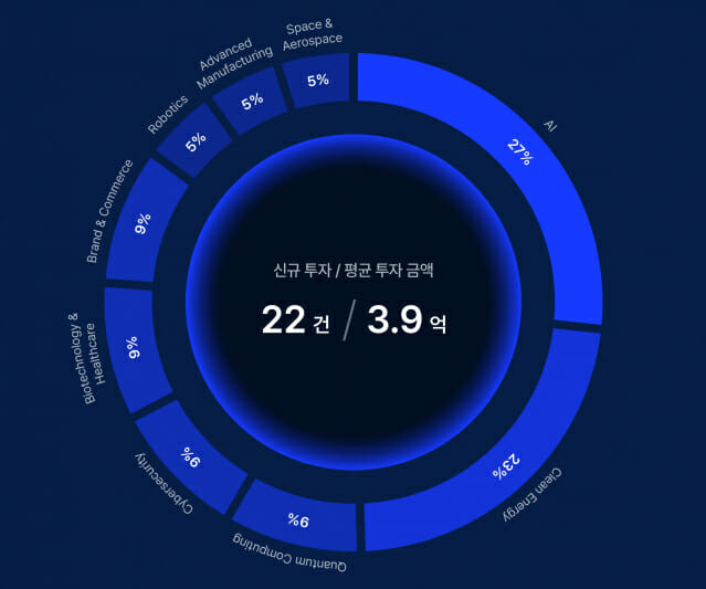 신규 투자 포트폴리오는 산업별로 인공지능(AI)이 27%로 가장 많았고 ▲클린에너지 23% ▲양자컴퓨팅 9% ▲사이버보안 9% ▲바이오·헬스케어 9% ▲브랜드·커머스 9% ▲로보틱스 5% ▲첨단제조 5% ▲우주·항공 5% 순으로 나타났다.