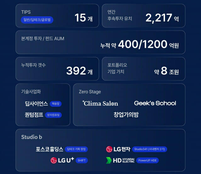 딥테크 전문성을 바탕으로 AI와 클린에너지 등 미래 핵심 산업에 집중 투자했다. 중소벤처기업부 기술창업지원 프로그램 팁스에는 일반·딥테크·글로벌 분야에서 총 15개 팀이 선정됐다.