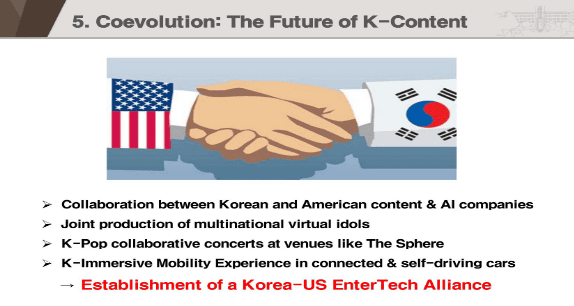 이어, "이를 위해 한국과 미국의 OTT와 AI 플랫폼 사업자, 콘텐츠 제작자, 스타트업 등이 함께 참여하고 연대하는 '엔터테크 얼라이언스'를 구축할 필요가 있다"고 강조했다.