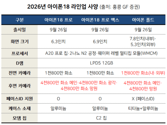 제프 푸 홍콩 GF 증권 분석가가 최근 보고서를 통해 2026년 아이폰18 라인업의 제품 사양과 출하량 전망치를 공개했다고 IT매체 나인투파이브맥이 16일(현지시간) 보도했다.