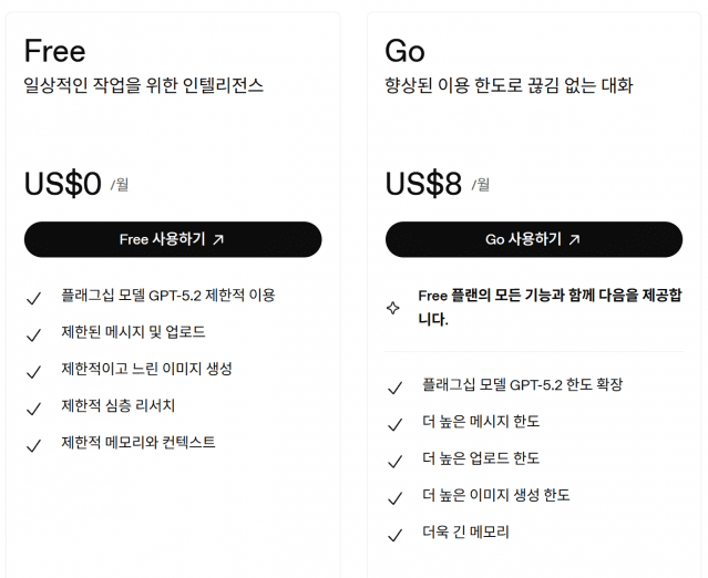 오픈AI는 16일(현지시간) 챗GPT 고 요금제를 170개국으로 확대한다고 밝혔다. 기존에는 인도 등 일부 국가에서만 제공됐지만, 이날부터 미국에서도 이용할 수 있다. 월 구독료는 8달러(약 1만2천원)로, 현재 제공되는 유료 요금제 가운데 가장 저렴하다.