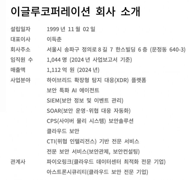 이글루는 보안 1세대 기업이다. 1999년 11월 2일 설립됐다. 당초 사명은 이글루시큐리티였다. 2022년 3월 현재의 이글루코퍼레이션으로 바꿨다. 2010년 8월 4일 코스닥에 상장했다.