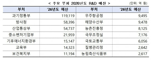 부처별 R&D 투입 예산은 ▲과기정통부 11조9119억원 ▲방사청 5조8396억원 ▲산업통상부 5조4737억원 ▲중소벤처기업부 2조1959억원 ▲기후에너지환경부 1조5147억원 ▲우주항공청 9천495억원 ▲국무조정실 7천176억원 ▲국토교통부 6천56억원 등이다.