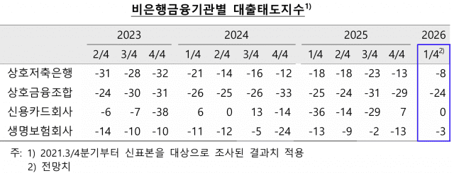 은행을 제외한 저축은행·상호금융조합·신용카드·생명보험사들의 대출 태도도 작년보다 다소 완화될 것으로 점쳐진다. 그렇지만 은행에 비해서는 강화된 기조다.