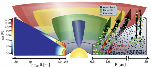 또한, 연구팀은 원반 안쪽에서 생성된 결정질 규산염이 원반풍에 의해 차가운 외곽으로 운반될 수 있다는 것도 밝혀냈다. 원반풍은 가스가 별이나 블랙홀 같은 천체 주위에서 돌며 바깥쪽으로 불어가는 현상이다.