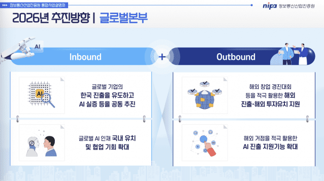 글로벌 분야에서는 AICT 산업의 해외시장 선점을 위한 지원을 확대한다. NIPA는 글로벌 신시장 개척을 통해 AICT 수출을 확대하고 해외 진출 역량을 내재화하겠다는 방향을 제시했다. 이를 위한 주요 사업으로 ICT 비즈니스 파트너십, 글로벌 ICT 미래유니콘 육성, 디지털 혁신기업 글로벌 성장 바우처 지원 등을 내세웠다.
